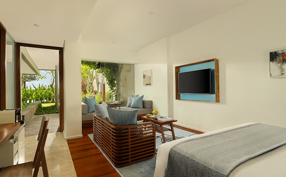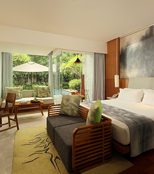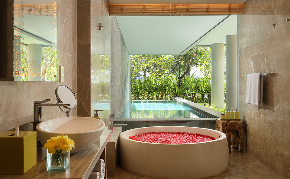 Steps away from Infinity beach pool and Sanur beach, Heavenly Pool Suite features an expansive living quarters highlighting a contemporary bathroom and glass en-suite with a generous circular bathtub. Suitable for couples and families, Heavenly Pool Suite features homey comfort with a private pool in a walled tropical garden.