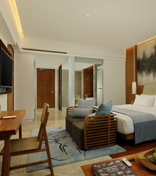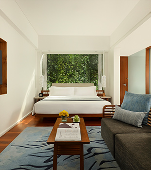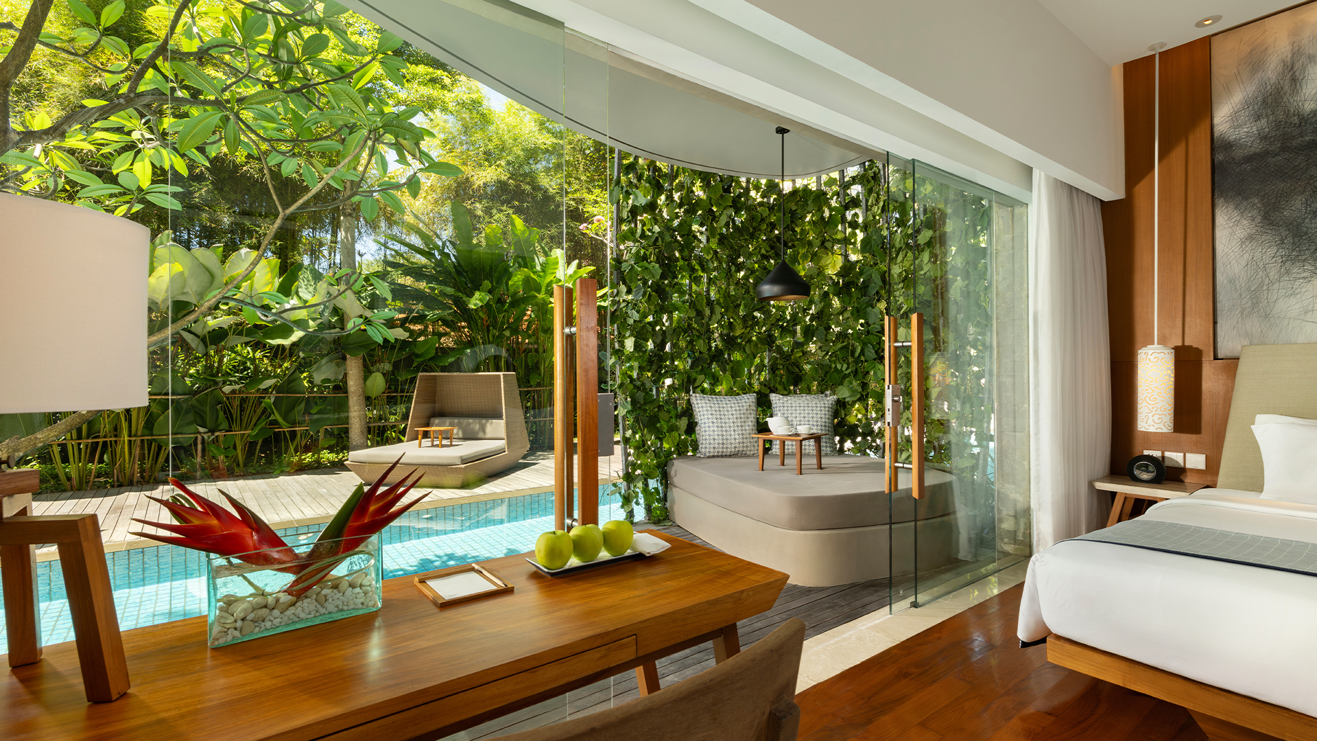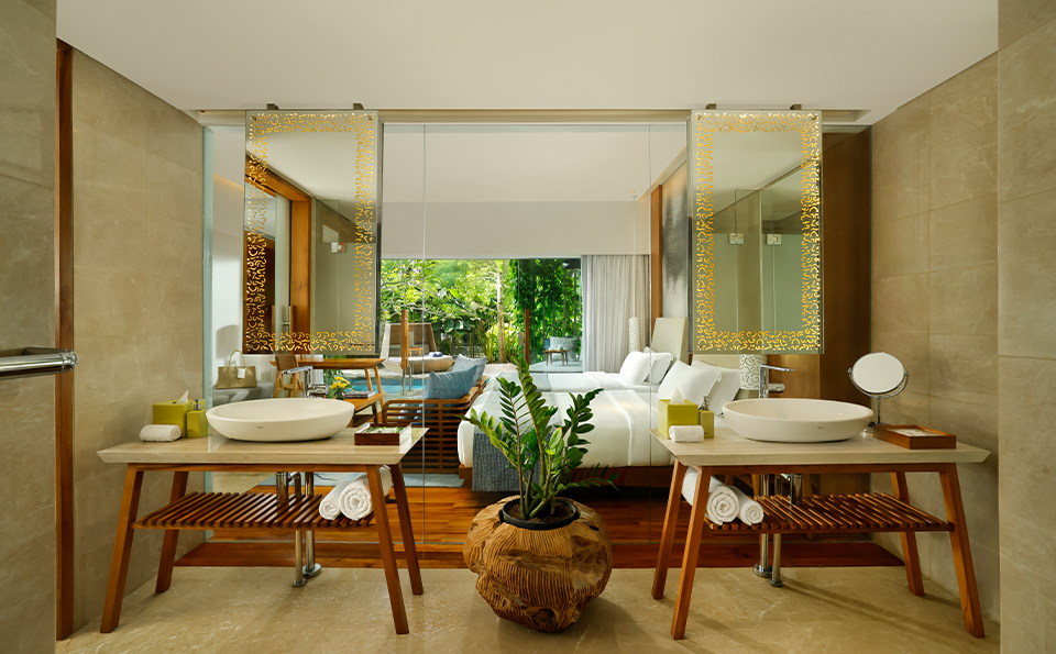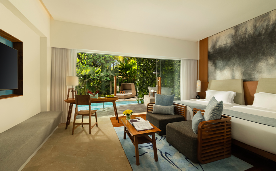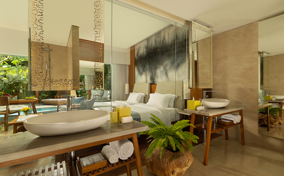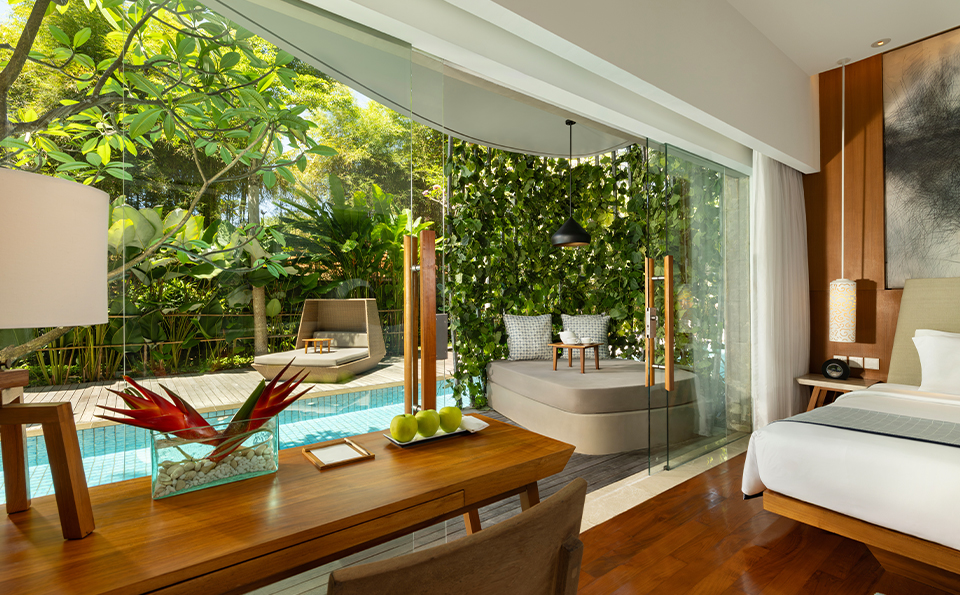 Behold! An expansive glass wall opens directly onto the terrace where a plush nest daybed and the revitalizing Lagoon Pool await you. This Impressive Lagoon Pool Suite provides a homely feel with everything one would expect for a luxurious stay.