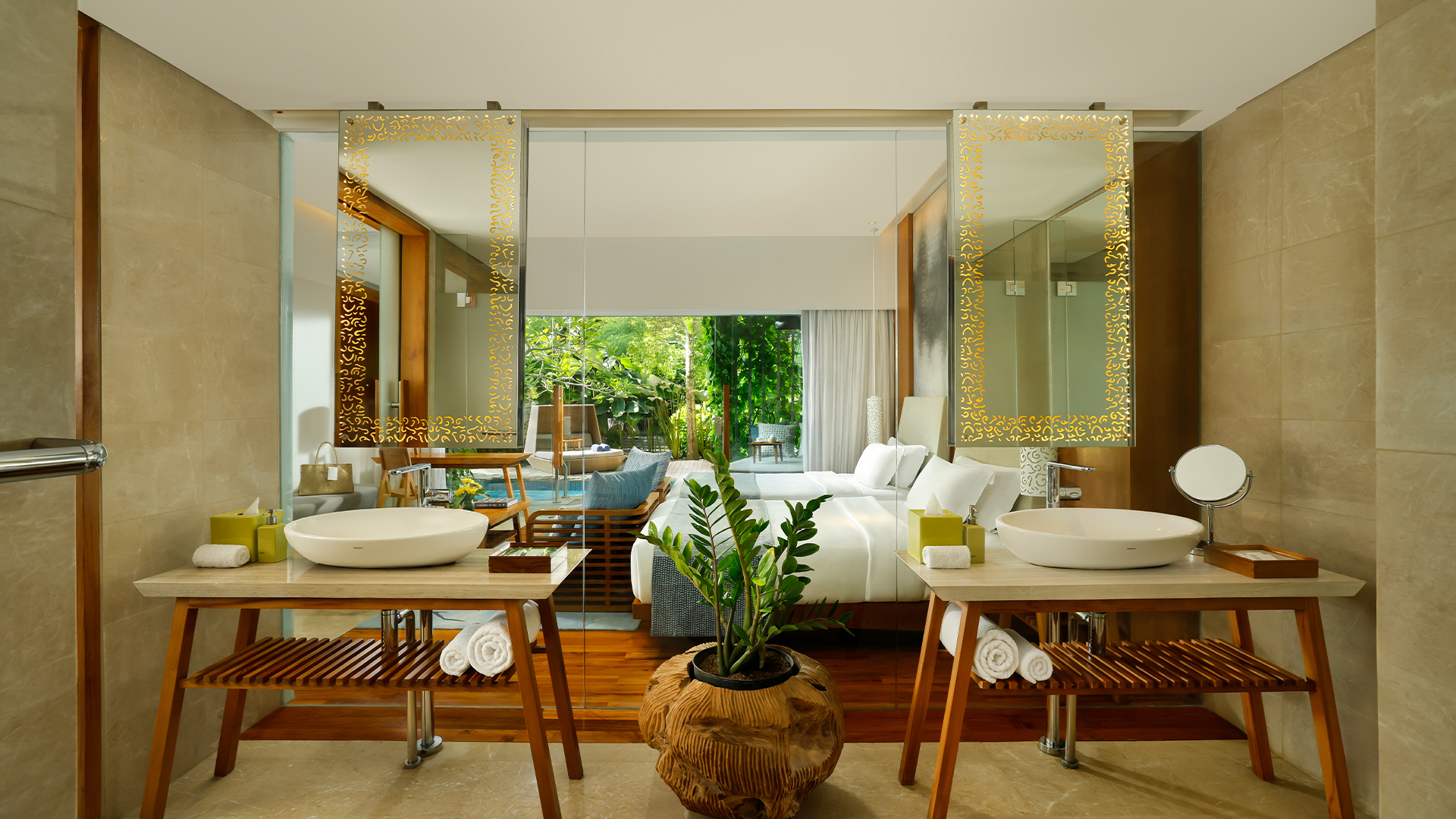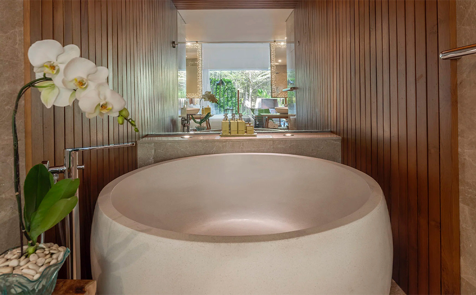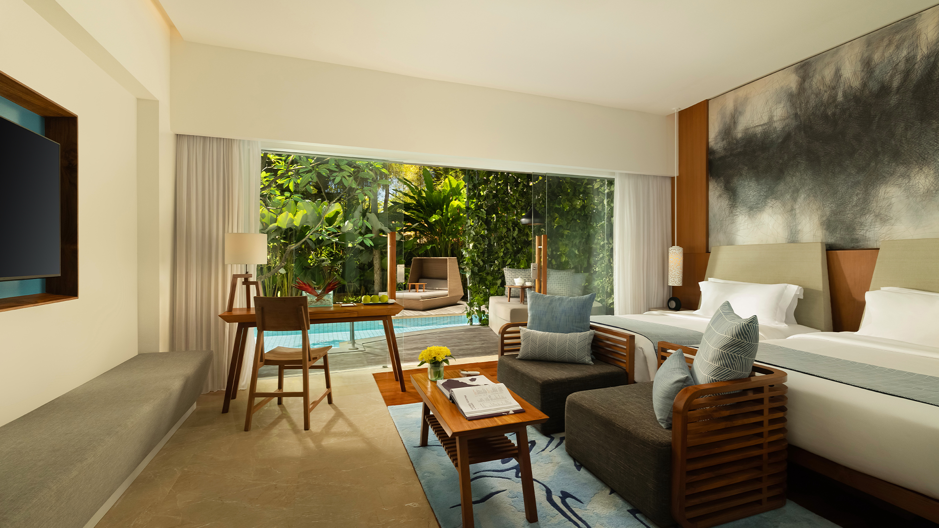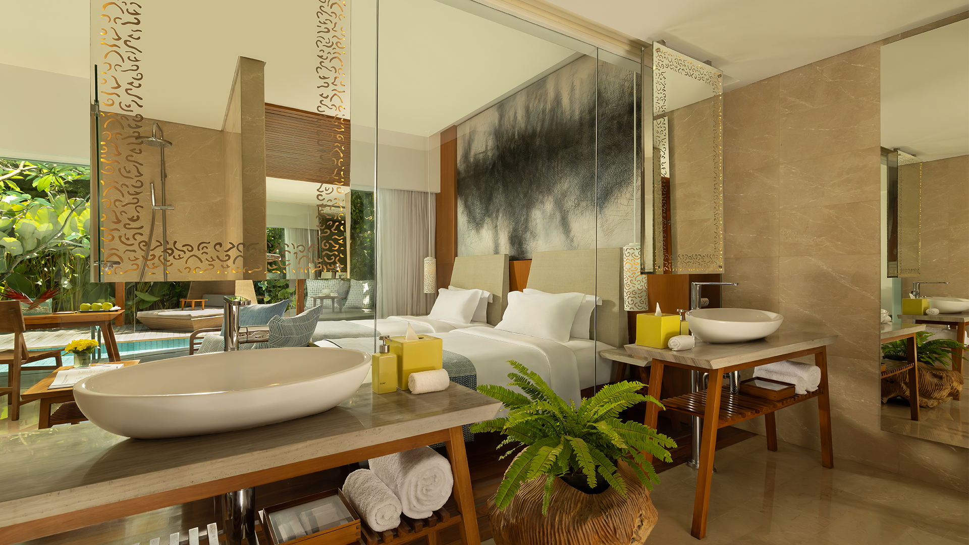 Behold! An expansive glass wall opens directly onto the terrace where a plush nest daybed and the revitalizing Lagoon Pool await you. This Impressive Lagoon Pool Suite provides a homely feel with everything one would expect for a luxurious stay.
