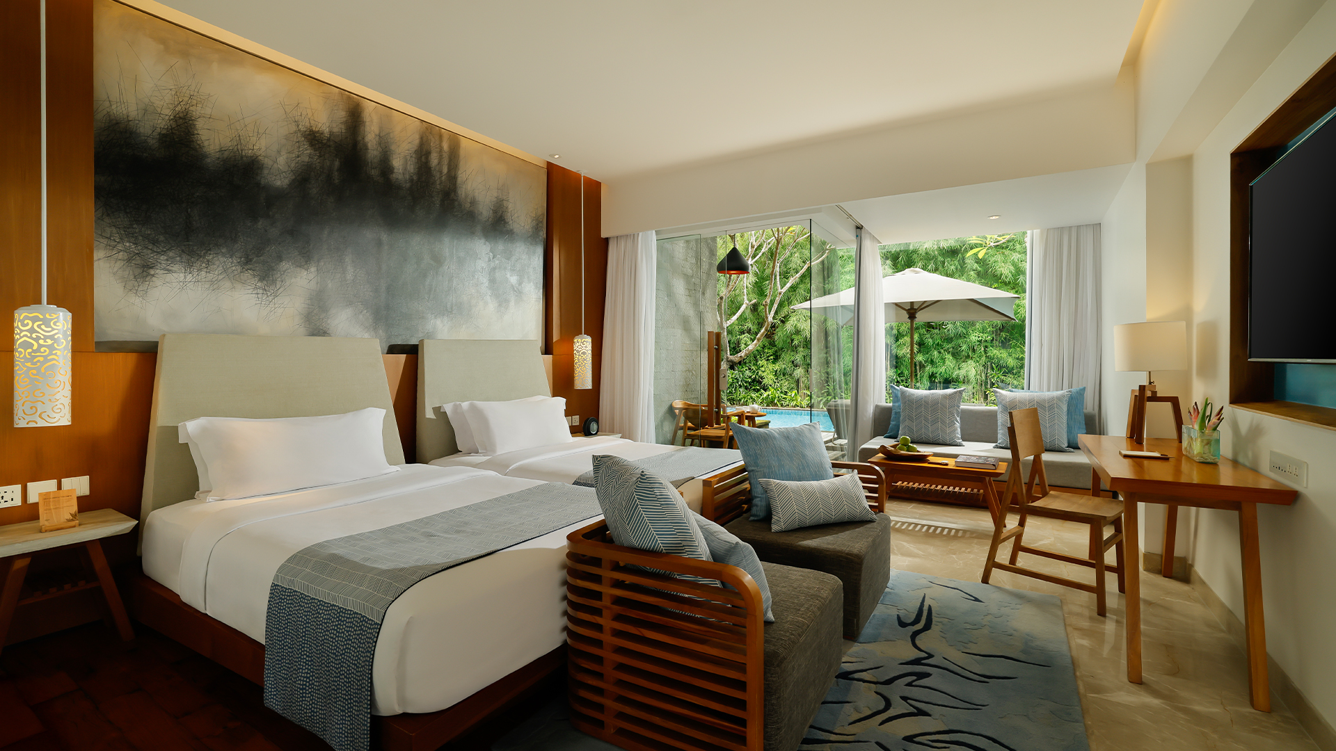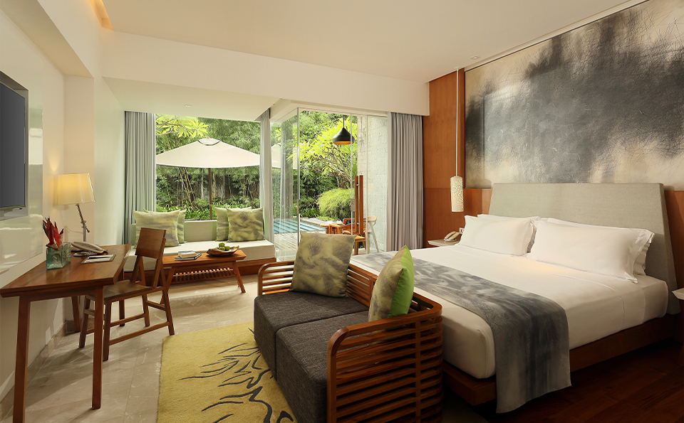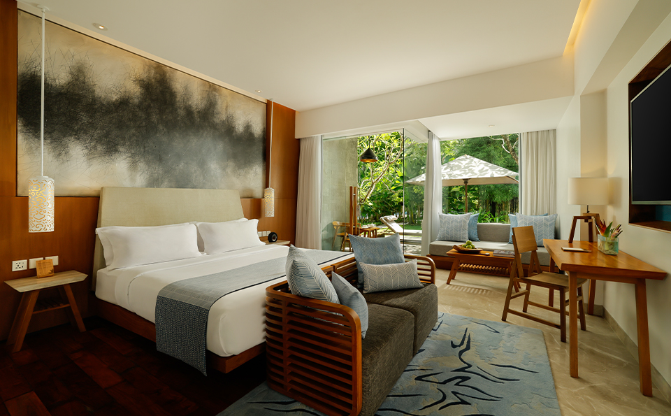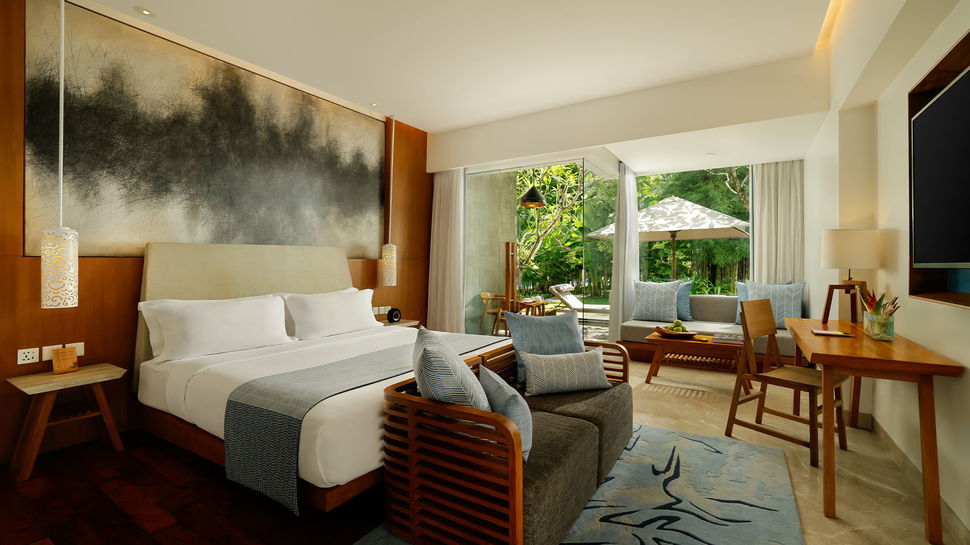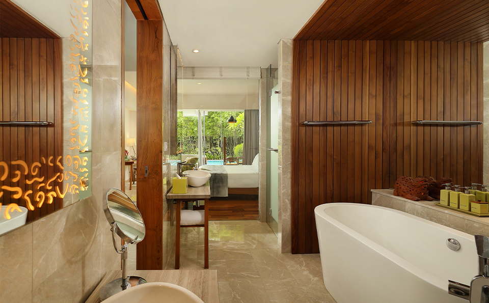 Delightfully direct swimming pool access, sun loungers on the balcony and tropical garden views mean these rooms are engineered for indoor-outdoor relaxation. A contemporary Balinese beach aesthetic conjures a marble-and-glass en-suite bathroom with a luxuriously free-standing bathtub. Dual vanity units are matched by separate shower and toilet cubicle for a super-spacious, spa-like bathroom experience. An ideal option for families, these rooms are conveniently situated near the kids' pool.