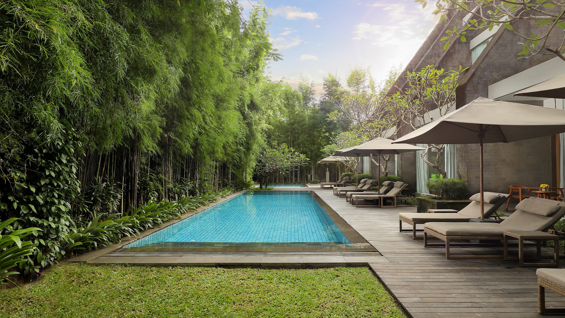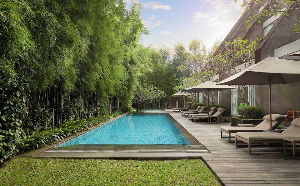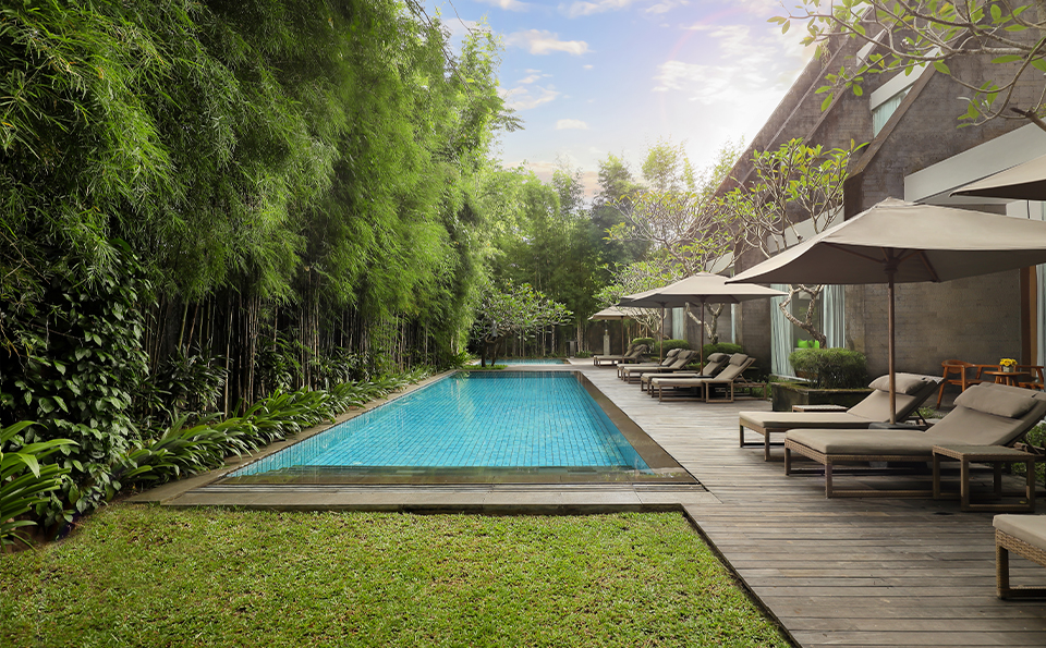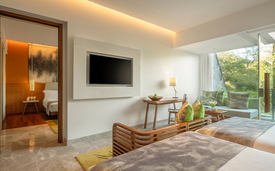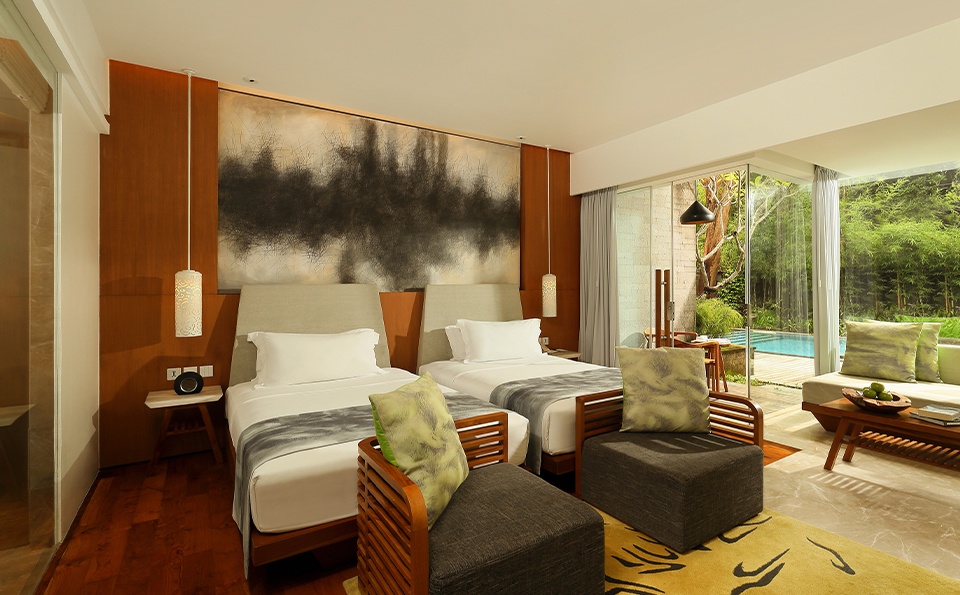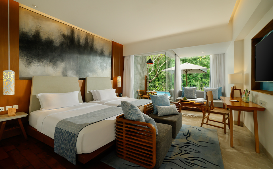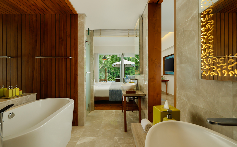 Delightfully direct swimming pool access, sun loungers on the balcony and tropical garden views mean these rooms are engineered for indoor-outdoor relaxation. A contemporary Balinese beach aesthetic conjures a marble-and-glass en-suite bathroom with a luxuriously free-standing bathtub. Dual vanity units are matched by separate shower and toilet cubicle for a super-spacious, spa-like bathroom experience. An ideal option for families, these rooms are conveniently situated near the kids' pool.