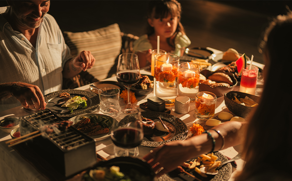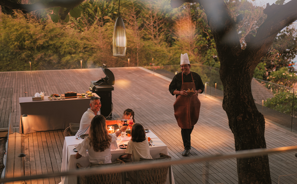 Enjoy a family BBQ dinner with stunning ocean views, featuring Grilled Snapper, Pork Ribs, and more. End on a sweet note with Mixed Berry Pavlova or Chocolate Lava Cake, and elevate your evening with our curated wine selection.
