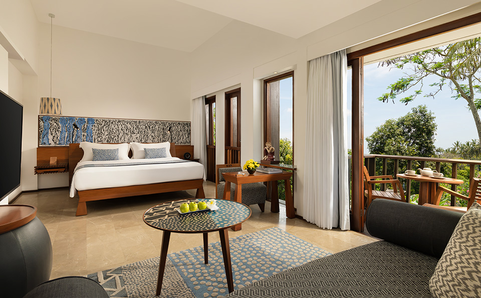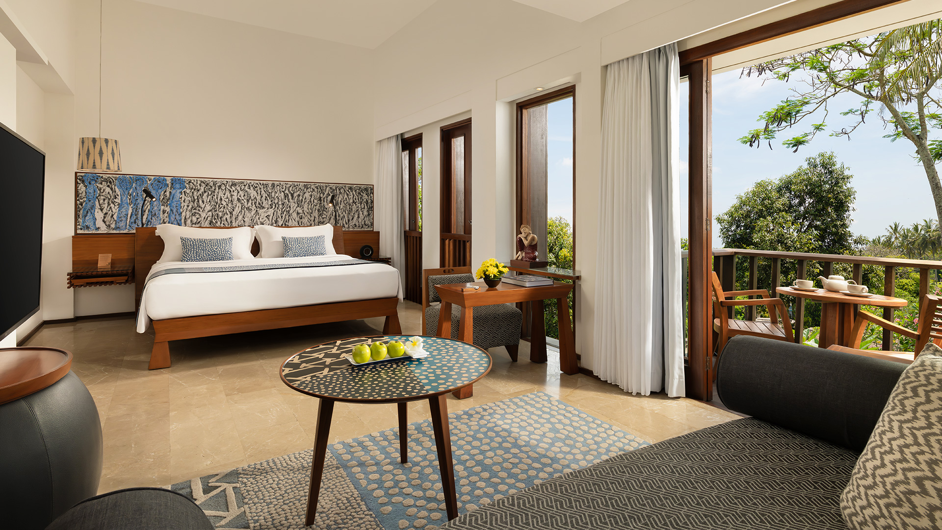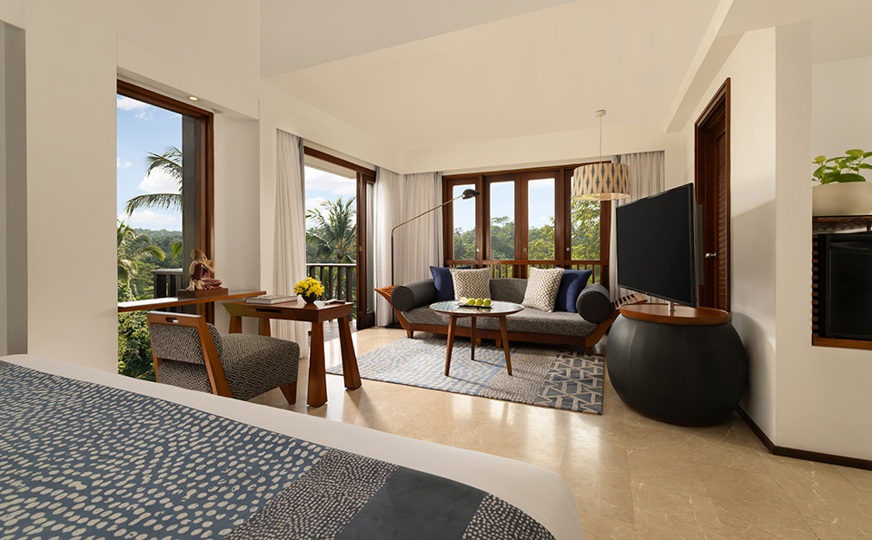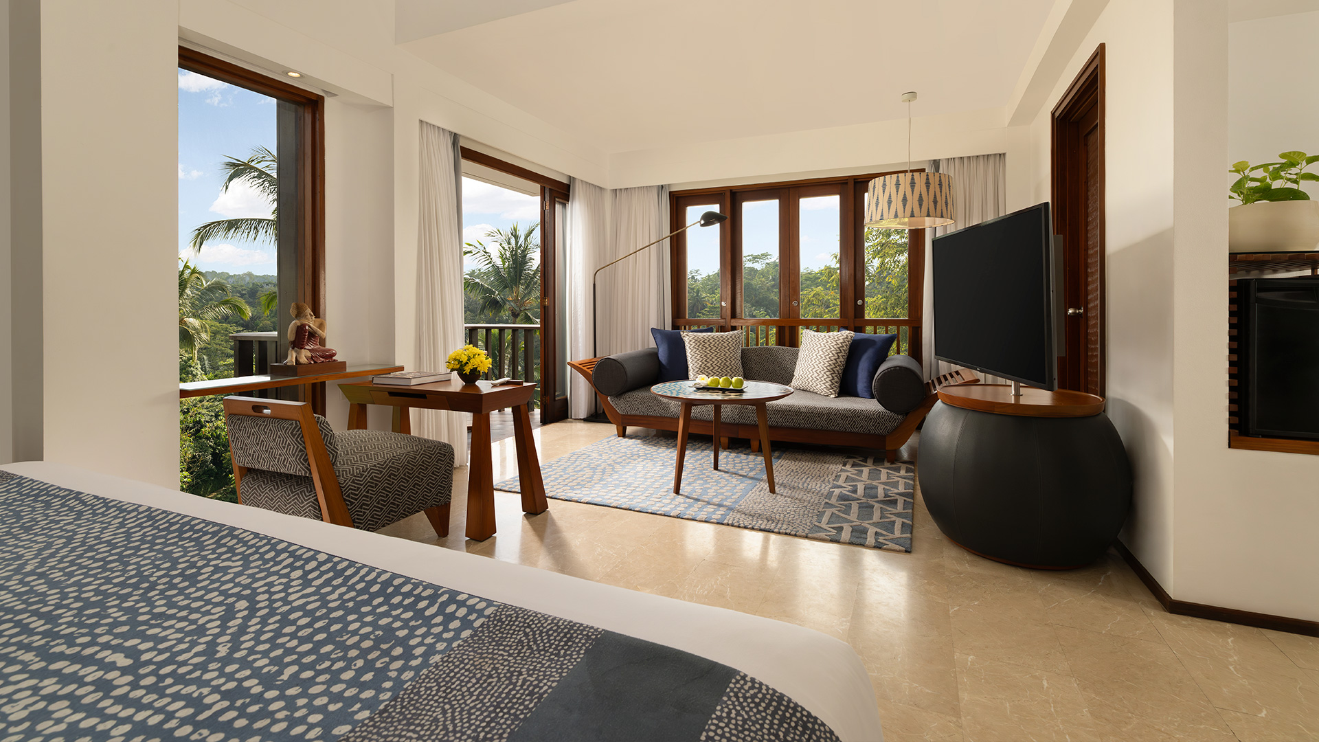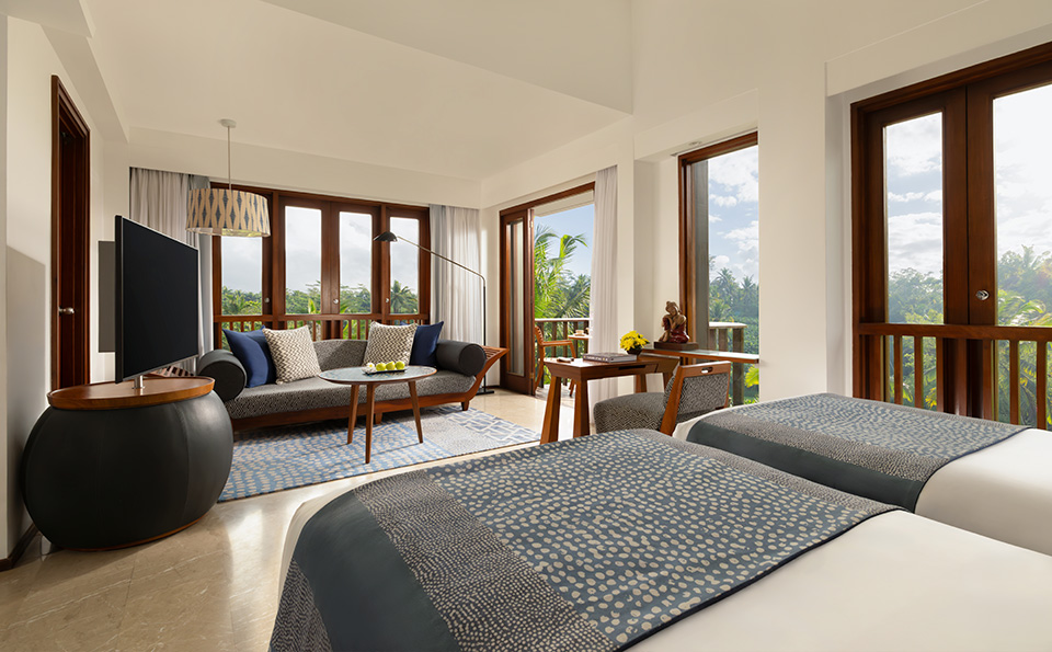 Believe the math: one corner equals two capacious balconies. Bathed in natural light, each Impressive Corner Suite features customized furnishings and a fresh, inspiring tone throughout. Admire the lush vegetation in the sanctuary from your expansive guestroom, adorned with Bali’s creative traditions. An in-room coffee machine and Bluetooth speaker system complete your home-from-home.