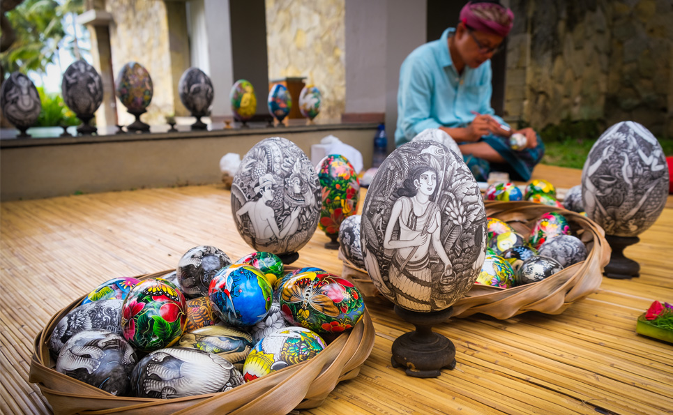 Experience the enchanting art of Balinese Egg Painting guided by the masterful hands of Ketut Bungkling, where each stroke tells a story and every color captures the spirit of timeless Balinese art.