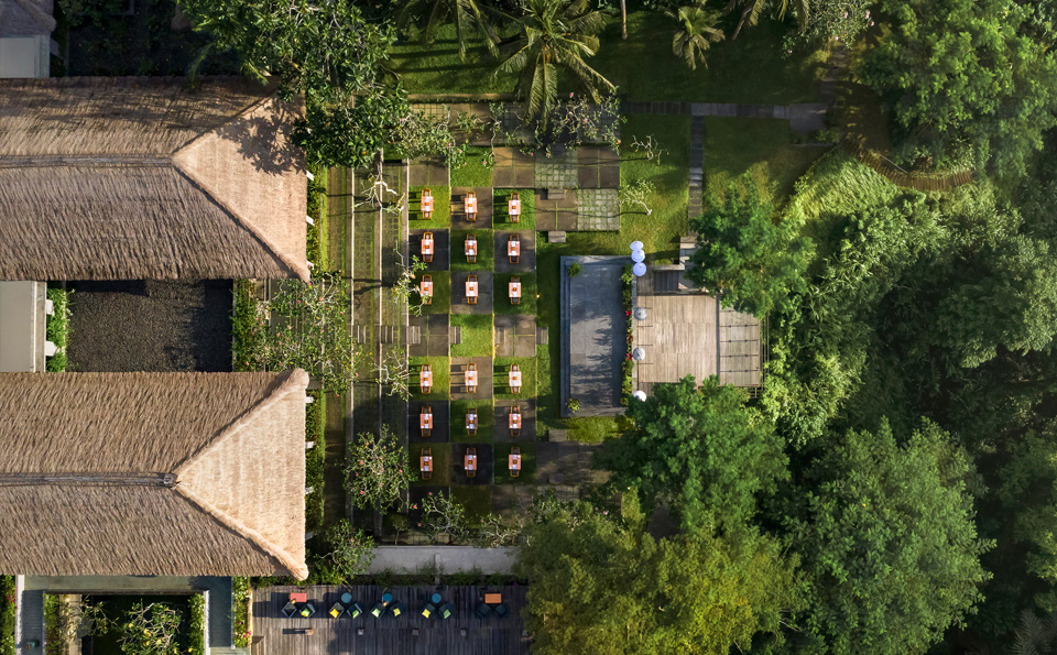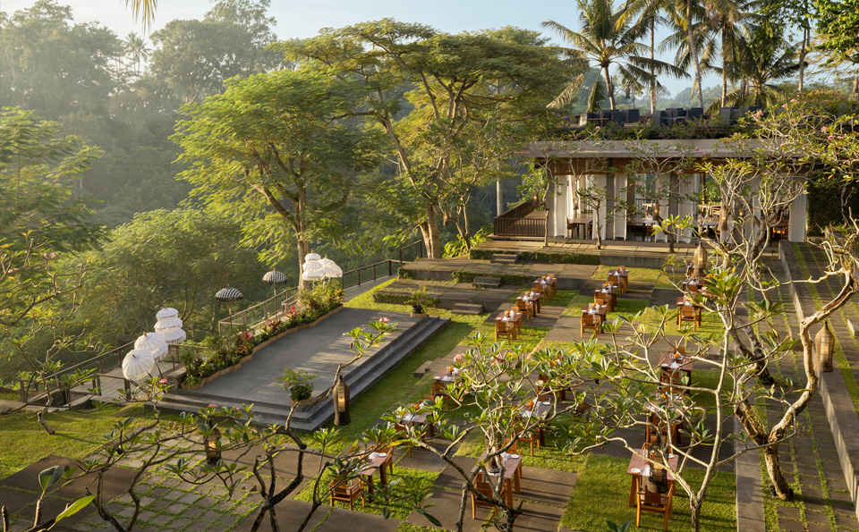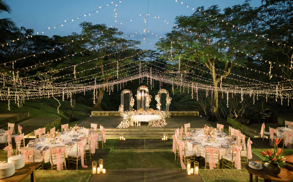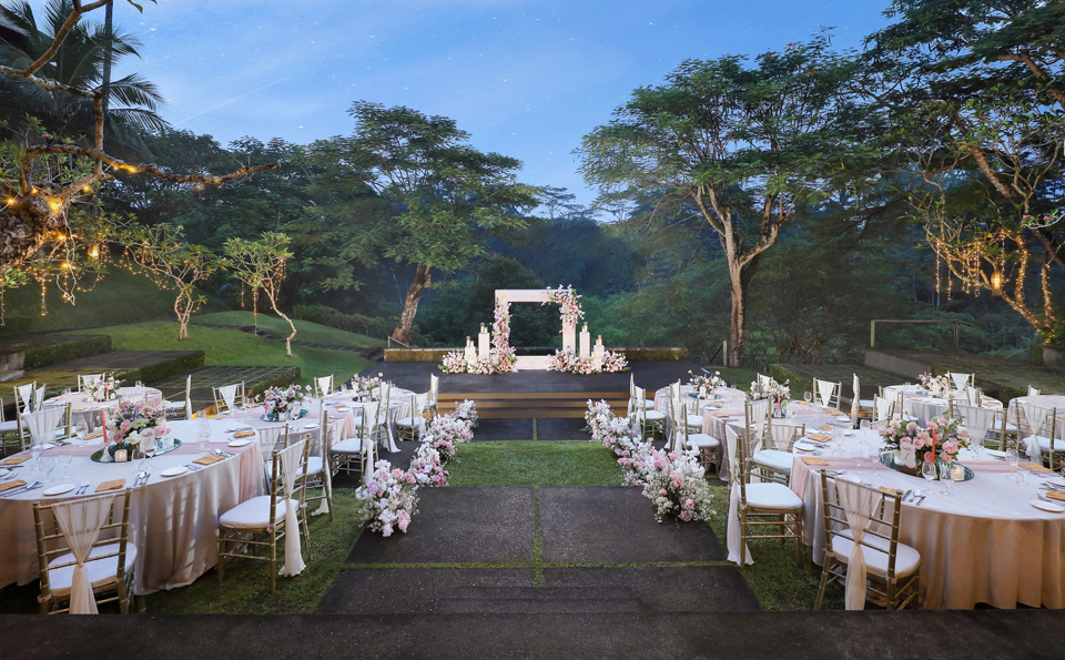 A stunningly spacious area, the Amphitheatre is a centerpiece cultural stage offering a green, woodsy, and earthy feel of the venue. Overlooking the lush greenery landscape of tropical rainforest, this tranquil area perfectly blends with the natural beauty and rustic charm of the surrounding. The venue transformed into an ideal setting on the arranged plaid stone terrace for a large outdoor wedding reception.